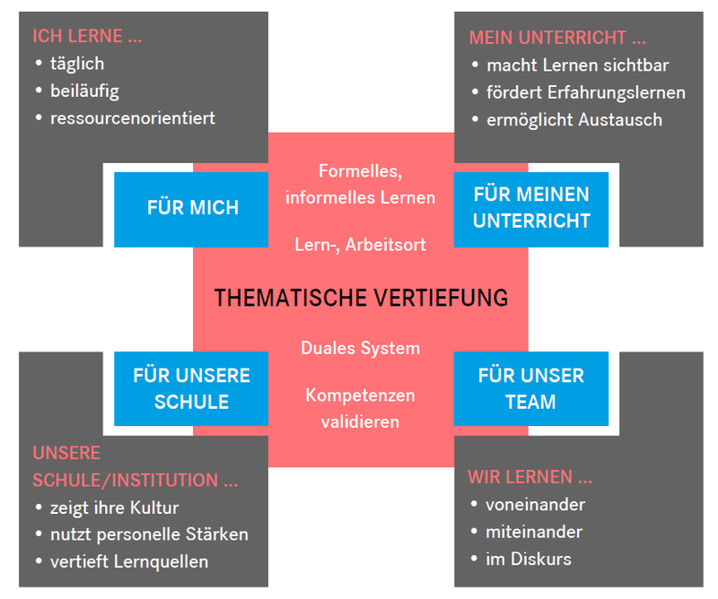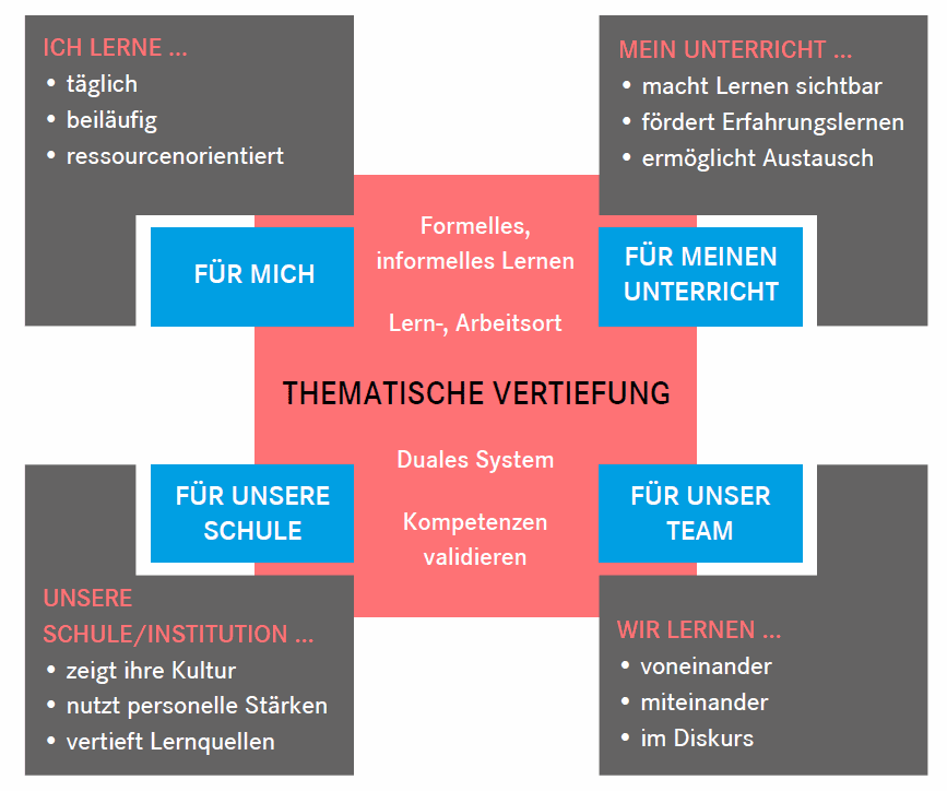 Solche kleinen und grossen Lerngelegenheiten kommen bei der Arbeit oft vor, sei es im Betrieb, im Büro, auf der Baustelle, im Unterricht oder bei Teamsitzungen. Einige Studien sprechen gar von etwa 60% unserer Kompetenzen, welche wir durch «Learning on the job» in konkreten Handlungssituationen und eigenen Erfahrungen entwickeln. Manche dieser Lernressourcen nutzen wir bewusst und reflektiert, meist alleine und gelegentlich auch im Team. Je nach Fokus können diese Situationen aus dem Arbeitsprozess eine inspirierende Lernquelle sein «für mich», «für meinen Unterricht», «für unser Team» wie auch «für unsere Schule». Diese inspirierende Lernquelle möchten wir durch unsere Angebote unter dem Schwerpunkt «Lernquelle Arbeit» gezielt anregen, Lernaspekte hervorheben und in den dialogischen Austausch bringen.