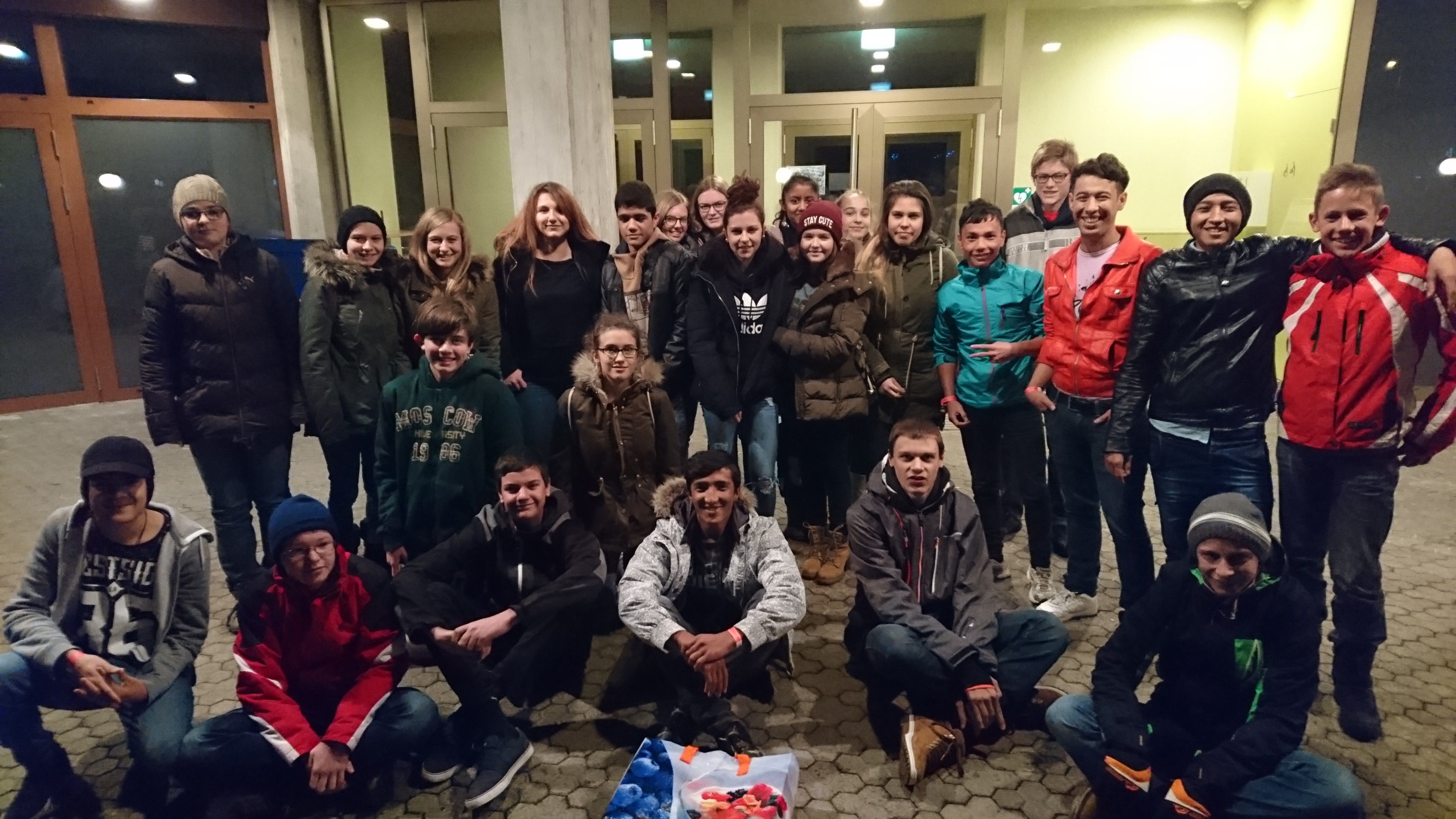 Am 29. November trafen wir uns dann vor der Schützenmatt in Menzingen. Schülerinnen und Schüler, Lehrer und sechs Bewohnerinnen und Bewohner des Bundeszentrums machten sich gemeinsam auf den Weg nach Bern, um die besagte Band bei ihrem Projekt für „Jeder Rappen zählt" zu unterstützen. Berndeutsche Texte sind auch für uns keine einfache Lektüre und für unsere Gäste erst recht nicht. Sie übersetzten den Text flugs nach dem Gehör in lautgetreue arabische Schriftzeichen und konnten so das ganze Lied mitsingen. Das Engagement, welches sie an den Tag legten, war beeindruckend. Worte wie Motivation, Engagement, Durchhaltevermögen, welche in unserem Berufsalltag sehr geläufig sind, erhielten eine komplett neue Dimension.
