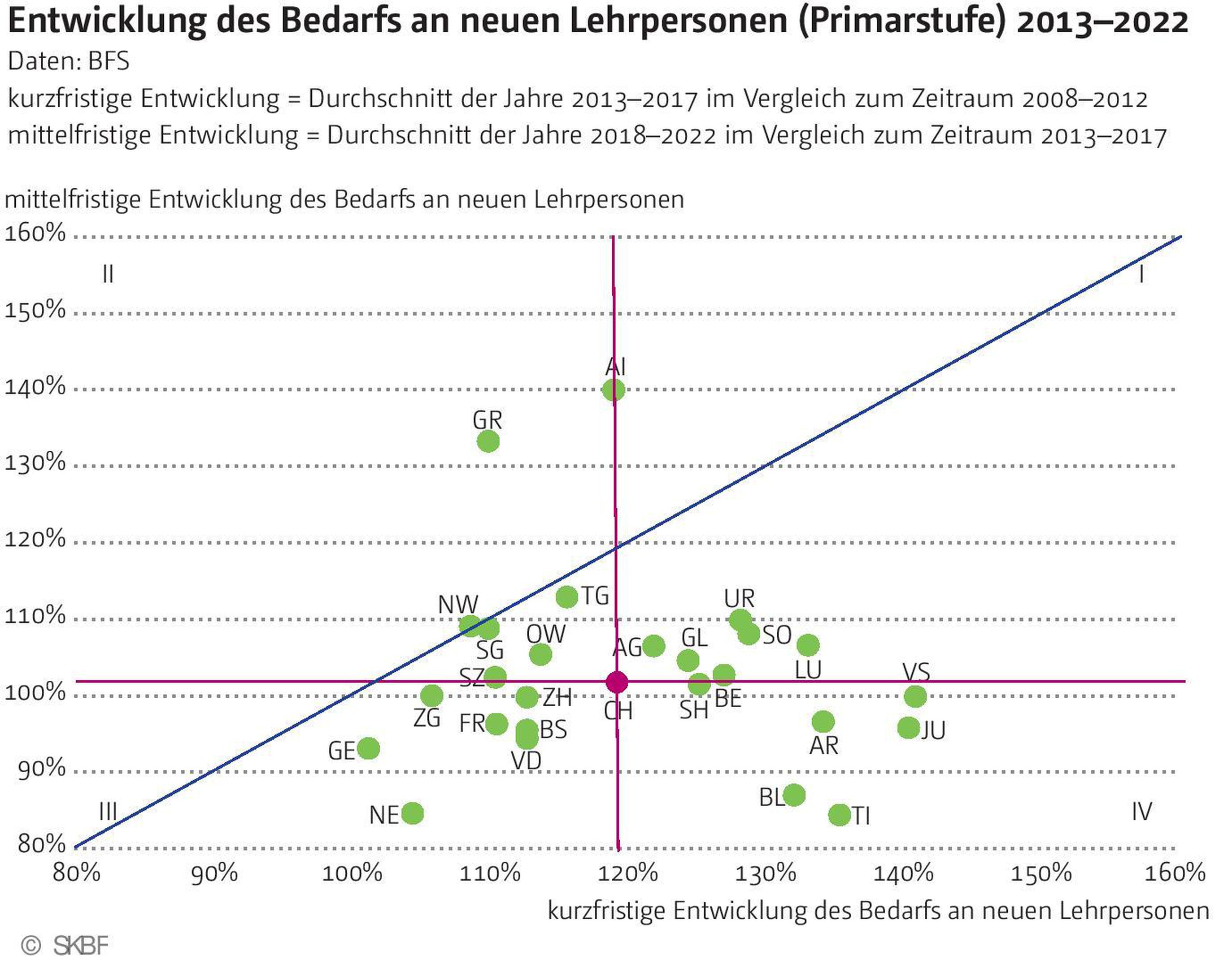 Die Achsen (rote Linien im Diagramm) stellen die jeweiligen schweizerischen Mittelwerte dar und ermöglichen einen interkantonalen Vergleich: Kantone in der rechten Diagrammhälfte erfahren in der kurzen Frist (d. h. im Zeitraum 2013–2017) einen im schweizerischen Vergleich überdurchschnittlichen Anstieg ihres Rekrutierungsbedarfs, Kantone in der linken Hälfte hingegen einen unterdurchschnittlichen. Die obere Hälfte wiederum vereint Kantone, welche erst mittelfristig (d. h. im Zeitraum 2018–2022) einen überdurchschnittlichen Anstieg des Rekrutierungsbedarfs erfahren werden, und in der unteren Hälfte ist es umgekehrt. Die Quadranten repräsentieren also unterschiedliche Muster. Im ersten Quadranten finden sich Kantone wie Aargau, Solothurn, Bern oder Luzern, welche kurz- und mittelfristig einen überdurchschnittlichen Rekrutierungsbedarf aufweisen werden, während etwa die Westschweizer Kantone Neuenburg, Genf, Waadt, aber auch Zürich oder Basel-Stadt, einen unterdurchschnittlichen oder gar abnehmenden Bedarf an neuen Lehrkräften auf der Primarstufe verzeichnen (vgl. Grafik 1).