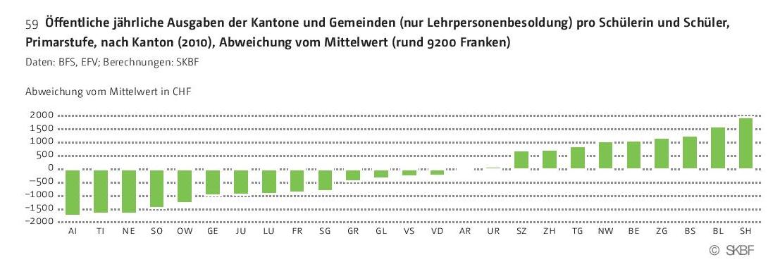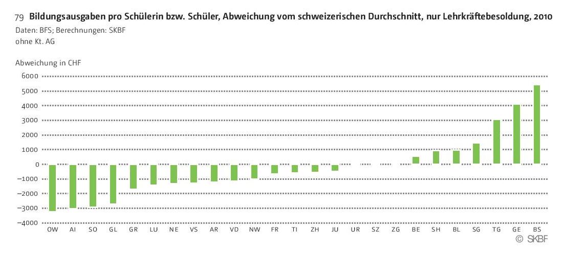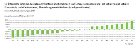 Die Bildungsfinanzstatistik weist für die Kantone und Gemeinden die jährlichen Ausgaben für Lehrer- und Personalbesoldung, Sachaufwand, weitere laufende Verpflichtungen sowie Investitionen auf der Primarstufe aus. Da für den Kanton Aargau keine Angaben vorliegen, bleibt er in der Darstellung unberücksichtigt.