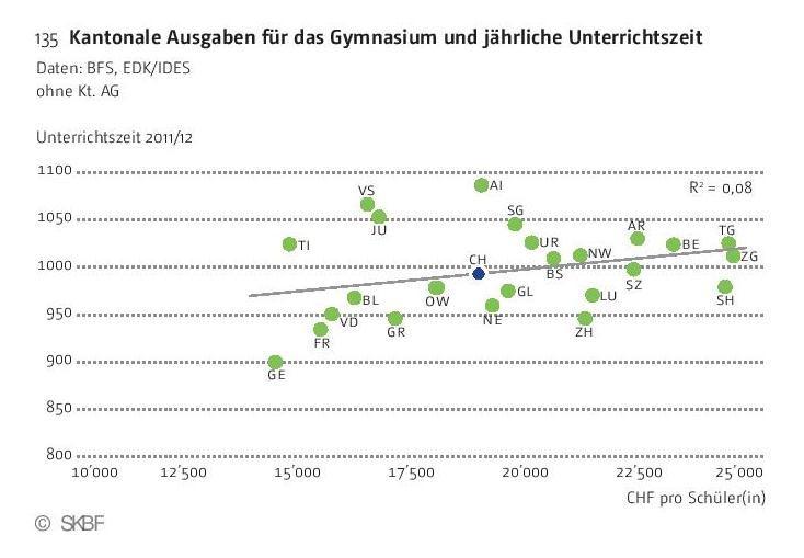 Trotz Vorbehalten bezüglich der Vergleichbarkeit kann man aufgrund der vorhandenen Finanzdaten auf Stufe Gymnasium schliessen, dass die Investitionen in die gymnasiale Ausbildung von Kanton zu Kanton stark variieren. Die starke Varianz der Ausgaben ergibt pro ausgebildete(n) Maturandin und Maturanden hochgerechnet auf die gesamte Ausbildungsdauer Kostenunterschiede im hohen fünfstelligen Bereich. Diese Differenzen lassen sich (wie auf Stufe Primar- und Sekundarstufe I) nicht einfach erklären. Dass hohe Ausgaben auf hohe Inputkosten wie bspw. Löhne hinweisen und umgekehrt, muss vermutet werden. Ein Zusammenhang zwischen den Ausgaben und der jährlichen Unterrichtszeit in den Kantonen kann hingegen nicht aufgezeigt werden.