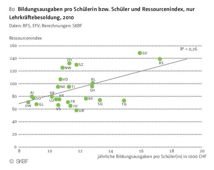 Die Zahlen zeigen kantonal erhebliche Unterschiede bei den Ausgaben für Lehrpersonenbesoldungen im Verhältnis zur Anzahl Schülerinnen und Schüler. Die Spannweite auf der Primarstufe beispielsweise zwischen dem Kanton mit dem höchsten und jenem mit dem tiefsten Aufwand für die Lehrpersonenbesoldung beträgt 40% des durchschnittlichen Aufwandes von rund 9200 Franken. Die Unterschiede können auf verschiedene Faktoren zurückgeführt werden. So kann ein allgemein hohes Lohnniveau in einem Kanton auch die Personalausgaben in den Schulen steigern. Auch ein hoher Anteil an kleinen Klassen kann kostensteigernd wirken. Unterschiede in der Altersstruktur des Lehrkörpers, Differenzen in den Lohnnebenkosten oder unterschiedliche pädagogische Angebote kommen als Erklärungen ebenfalls in Frage. Die Differenzen können auch beeinflusst sein durch die unterschiedliche Finanzkraft der Kantone. Ein finanzstarker Kanton kann höhere Aufwendungen im Bildungswesen natürlich eher verkraften als ein finanzschwacher Kanton. Analysiert man die Finanzkraft als Einflussfaktor (damit sind die Zahlungsfähigkeit und das Preisniveau des Kantons gemeint, was als Ressourcenindex ausgewiesen wird) beispielsweise für die Sekundarstufe I, lässt sich damit ein Viertel der Varianz in den kantonalen Bildungsausgaben erklären. Die Unterschiede bei den Bildungsausgaben pro Schüler und Schülerin zwischen den Kantonen sind demnach zu einem Viertel auf die kantonale Finanzkraft zurückzuführen. Mit der untenstehenden Grafik kann ebenfalls verdeutlicht werden, dass die Ausgaben eines Kantons für die Lehrkräftebesoldung tendenziell höher ausfallen, wenn der kantonale Ressourcenindex hoch ist. Allerdings ist aus den höheren Aufwendungen nicht ersichtlich, ob diese auch zu real grösseren Investitionen führen oder ob finanzstarke Kantone dieselbe Inputqualität einfach teurer einkaufen müssen.