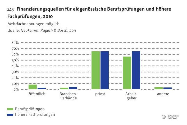 Bezüglich der Vorkurse und der Prüfungsgebühren ergab die Erhebung von Neukomm, Rageth & Bösch (2011) für das Jahr 2010, dass rund ein Fünftel der Studierenden alle Kosten selbst deckten, während die übrigen 80% ganz oder teilweise in den Genuss von arbeitgeberseitiger Unterstützung kamen; bei einem Viertel der Studierenden übernahmen die Arbeitgeber die vollen Kosten. Die öffentlichen Subventionen fliessen mehrheitlich in Form von Stipendien an die Studierenden. Die öffentlichen Ausgaben für Prüfungen können hingegen nur aus den öffentlichen Ausgaben für die höhere Berufsbildung eruiert werden, da sie für die Prüfungsteilnehmenden nicht ersichtlich sind. Die Bundesbeiträge an die Prüfungsaufwendungen decken ab 1.1.2013 60% und in Ausnahmefällen 80% der Gestehungskosten. Momentan monetär nicht ausgewiesen werden Vergütungen, welche die Arbeitgeber in Form von Zeitgutschriften den Studierenden zukommen lassen. Dieser Ertrag wirkt sich bei den Studierenden in einer Reduktion der Opportunitätskosten der Ausbildung nieder, was wiederum deren Rentabilität erhöht. Die meisten Arbeitgeber versichern sich aber ihre Leistungen in Form von Abzahlungsklauseln, d.h. die Studierenden müssen sich zu einer vollständigen oder teilweisen Rückzahlung der Unterstützung verpflichten, falls sie den Arbeitgeber vor Ablauf einer bestimmten Zeit verlassen. Nur gerade etwas weniger als ein Viertel der arbeitgeberseitig unterstützten Studierenden war keinen Abzahlungsverpflichtungen unterworfen (Neukomm, Rageth und Bösch 2011). Schliesslich ist darauf hinzuweisen, dass ein Teil der Ausbildungskosten nachträglich vom steuerbaren Einkommen abgezogen werden kann. Mehr als zwei Drittel der von Neukomm, Rageth und Bösch (2011) befragten Personen gaben an, ihre Ausbildungskosten vollständig oder teilweise den Steuern abzuziehen; bei den Kandidatinnen und Kandidaten für höhere Fachprüfungen für reglementierte Berufe lag dieser Anteil gar bei über 95%. Je nach anwendbarem Grenzsteuersatz dürften sich somit zwischen einem Fünftel und einem Drittel der privat getragenen Berufsbildungskosten nachträglich refinanzieren lassen.