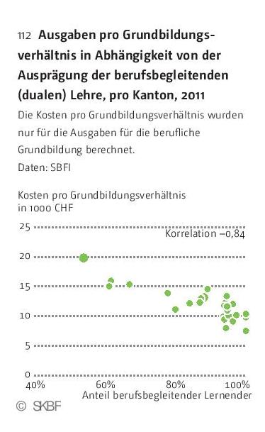 Welche Auswirkungen eine Übernahme der Ausbildungskosten durch die öffentliche Hand zur Folge hätte, lässt sich exemplarisch am Kanton Zürich zeigen. Würde der Kanton Zürich rund ein Drittel der Ausbildungsbetriebe der beruflichen Grundbildung verlieren und müsste somit die entsprechenden Lehrstellen in staatlichen Vollzeitausbildungsstätten anbieten, stiegen die öffentlichen Ausgaben für die berufliche Grundbildung um jährlich 160 Millionen Franken, was einer Steigerung um 38% entspricht.