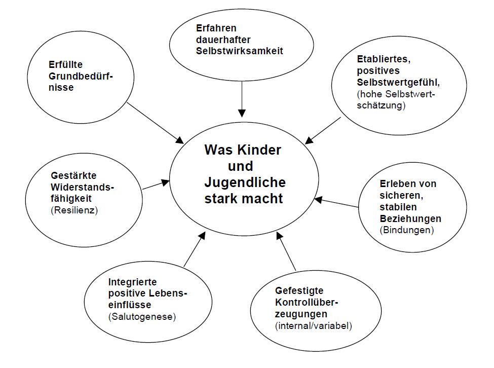 - Soziale Ressourcen, wie ein günstiges Familienklima, Vorhandensein von mindestens einer Vertrauensperson, Strukturen und Regeln im Haushalt, usw.
