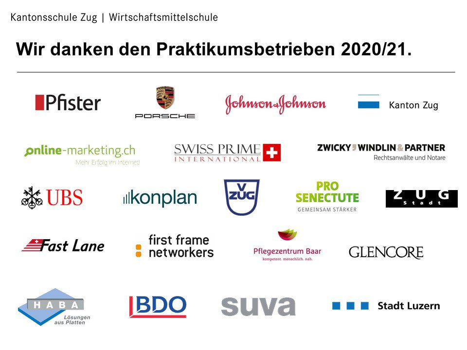 Betriebe im Schuljahr 2020/21, welche einen Praktikumsplatz für Schülerinnen und Schüler der WMS Zug anbieten.
