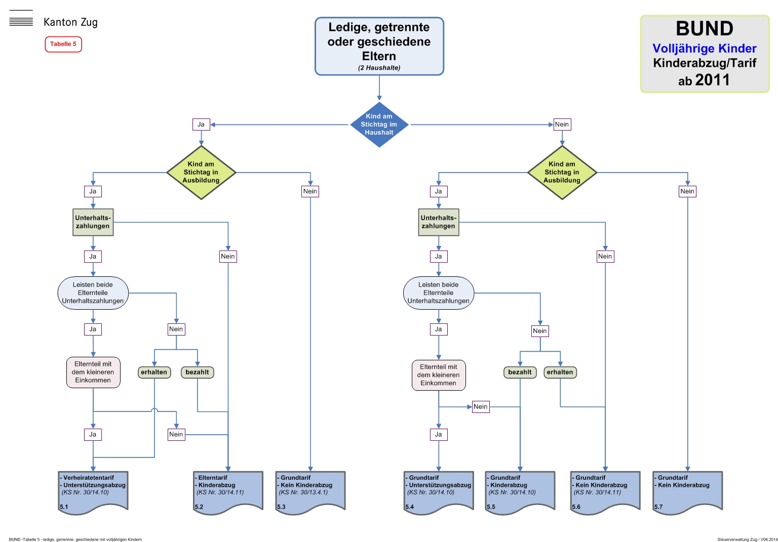 In den nachfolgenden Tabellen werden anhand der verschiedenen Familienkonstellationen die massgebenden Beurteilungskriterien im Zusammenhang mit der Gewährung des Kinderabzuges und der Festlegung des anwendbaren Tarifs im Detail aufgeführt.