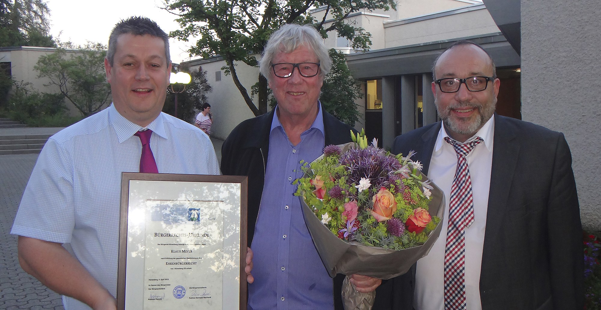 Der Bürgerrat hat an seiner Sitzung vom 9. April 2015, Klaus Meyer das Ehrenbürgerrecht von Hünenberg gemäss § 22 des kantonalen Einbürgerungsgesetzes verliehen. Damit setzt er ein Zeichen der Wertschätzung für seine ausserordentlichen Leistungen, insbesondere für das über 50-jährige kulturelle Schaffen in Hünenberg.