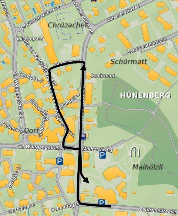 Chamerstrasse – Bergstrasse – alte St. Wolfgangstrasse – Eichengasse – St. Wolfgangstrasse – Chamerstrasse – Dorfplatz