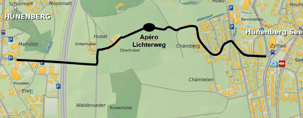 Der Lichterweg ist sowohl via öffentlichen Verkehr (Linien 41 und 51 Haltestelle «Dorf», sowie Linien 8 und S1 Haltestelle «Zythus») als auch mit Privatfahrzeugen (Parkplätze Zentrumstrasse und Zythus) bestens erreichbar.