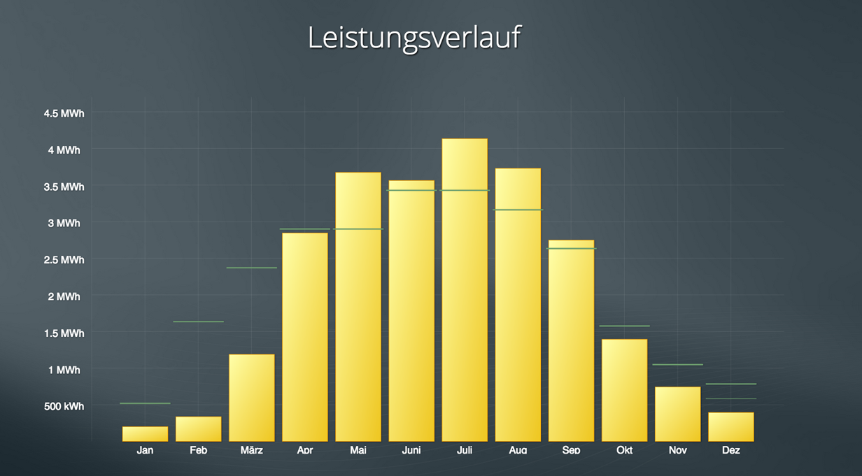 Die Grafik zeigt den Jahresverlauf der zweiten Anlage auf dem Dach der Odermatt Transline AG in kWh an. Sie wird monatlich aktualisiert.