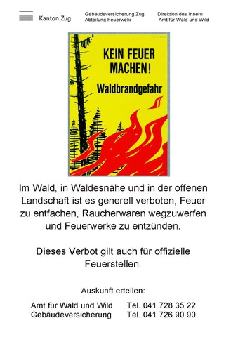 Die geringen Niederschläge der letzten Monate und die hohen Temperaturen im Juli führten im Kanton Zug zu grosser Trockenheit. Damit erhöht sich die Waldbrandgefahr erneut. Um die Gefahr von Bränden zu vermeiden bzw. zu reduzieren, gelten ab sofort besondere Vorschriften.