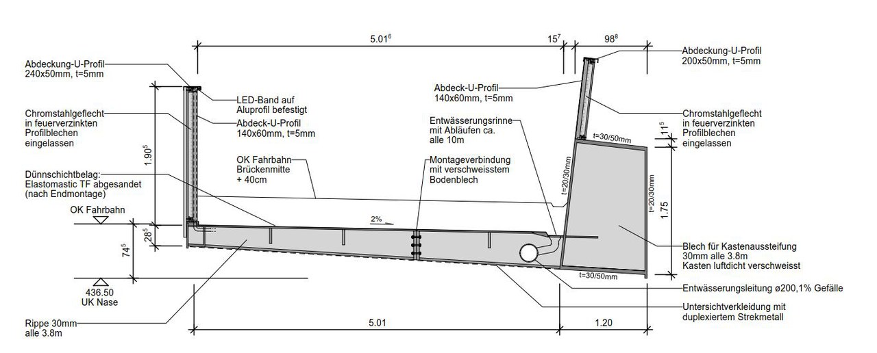 Die Fahrbahn weist ein Quergefälle von 2% auf. Entlang des Fahrbahnrandes ist eine flache und offene Entwässerungsrinne mit Abläufen im Abstand von rund 10 m angeordnet. Die Entwässerungsleitung ist in der Fahrbahnkonstruktion integriert. Die Brückenentwässerungsleitung wird innerhalb der Konstruktion ab Hochpunkt in Brückenmitte mit rund 1% Gefälle zu den Brückenenden geführt, wo die Leitungen in der Stahlkonstruktion des Liftturms heruntergeführt und an die bestehende Kanalisation angeschlossen werden.
