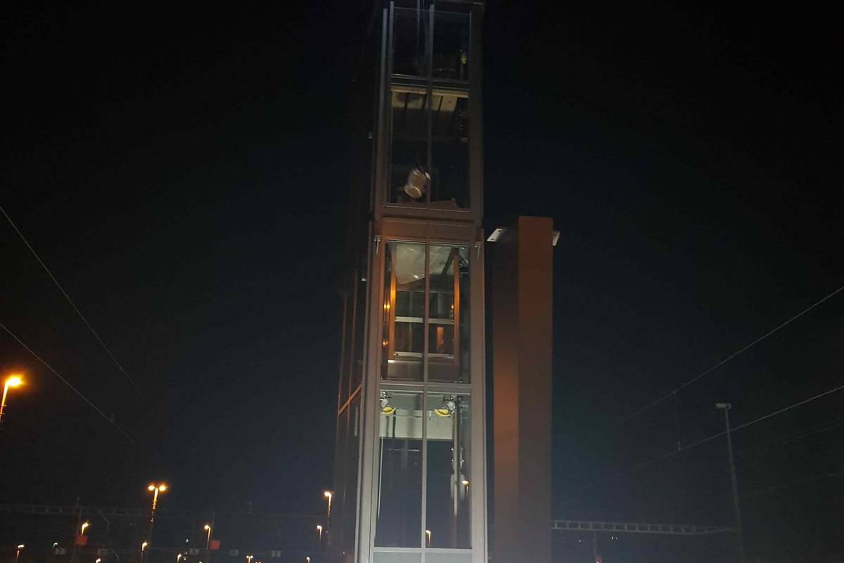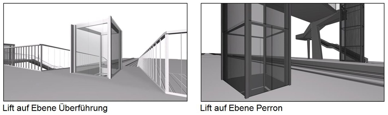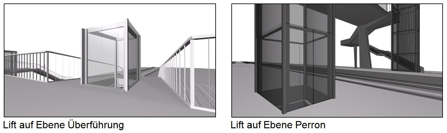 Die Lifttürme sind als allseitig verglaste Stahlkonstruktionen ausgebildet, wobei die Seitenflächen mit profiliertem Glas verkleidet werden. Durch die Anbindung der Lifttürme an die Brücke können die Stahlprofile schlank ausgebildet werden. Die Lifte haben auf Perron und Brückenniveau je eine Türe.