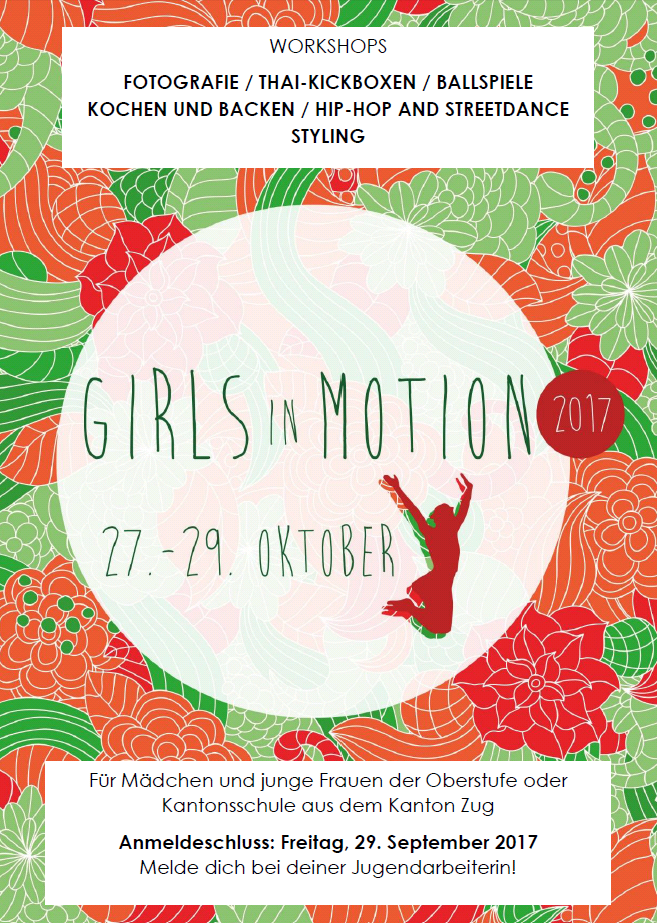 Girls in Motion ist ein erlebnisreiches Wochenende für Mädchen der 1.-3. Oberstufe aus dem Kanton Zug. Rund 60 Mädchen erleben vom 27. bis 29. Oktober 2017 interessante Workshops, spannende Inputs, ein vielfältiges Rahmenprogramm und typisches Lagerfeeling im Lagerhaus in Schüpfheim (LU).