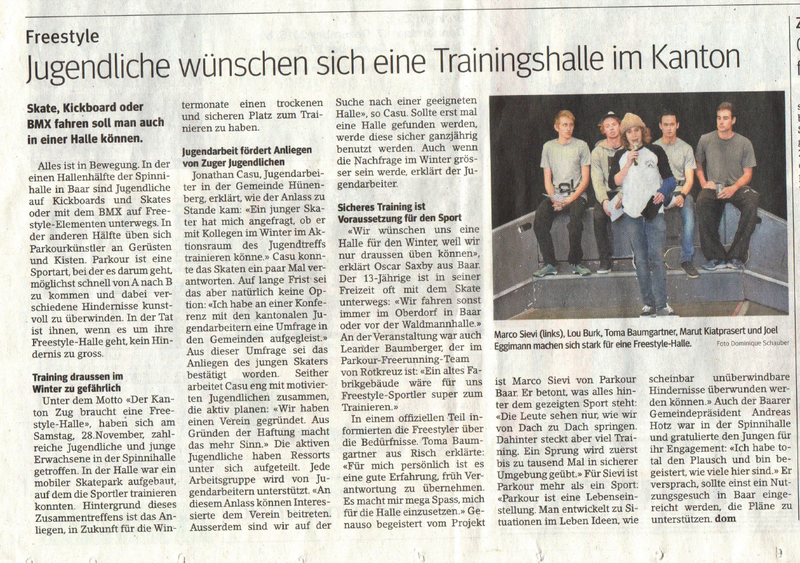 Hier ein aktueller Zeitungsbericht vom B Sports Festival in Zug am 21. August 2016: http://www.zentralplus.ch/de/news/gesellschaft/5505359/Skater-und-Co-feilen-am-Projekt-Freestyle-Halle.htm