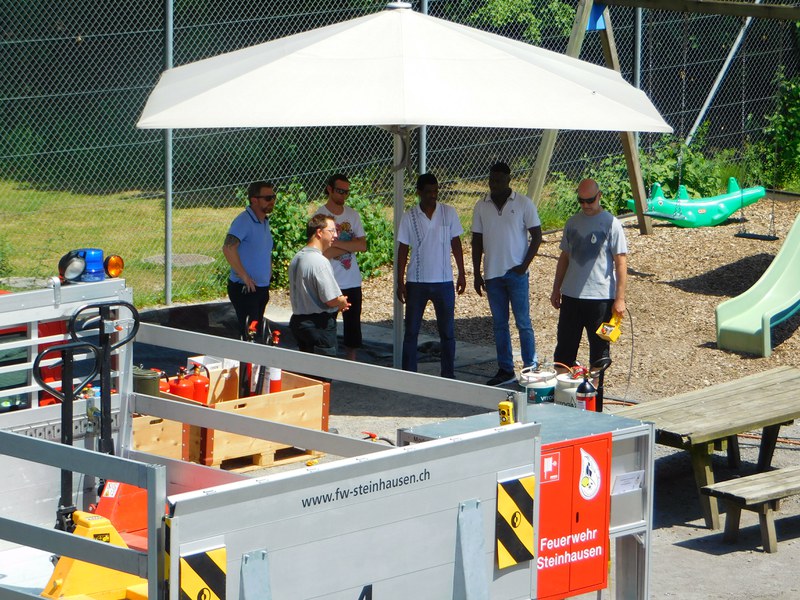 Am Donnerstag, 27. Juni 2019 fand in der Asyl-Durchgangsstation in Steinhausen eine Brandschutzschulung für alle Angestellten statt. Bei sommerlichen Temperaturen wurden die Teilnehmer im Umgang mit Feuerlöschern, dem Bekämpfen von Küchenbränden und der Bedienung ihres Löschpostens geschult. Zum Schluss durften Alle miterleben, was passiert, wenn man einen Fettbrand mit Wasser löscht.