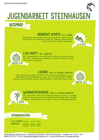 01.12.2017Monatsprogramm Dezember 2017Midnight Sports in den Feldheim Turnhallen, eine Party für die 2. Oberstufe und als Abschluss vom Jahr einen Casino-Abend - das läuft bei uns im Dezember.https://publisher-zgch-dev.webcloud7.ch/izug/platform/behoerden/gemeinden/steinhausen/jugendarbeit/infos/aktuelles/monatsprogramm-dezember-2017https://publisher-zgch-dev.webcloud7.ch/izug/platform/logo.png