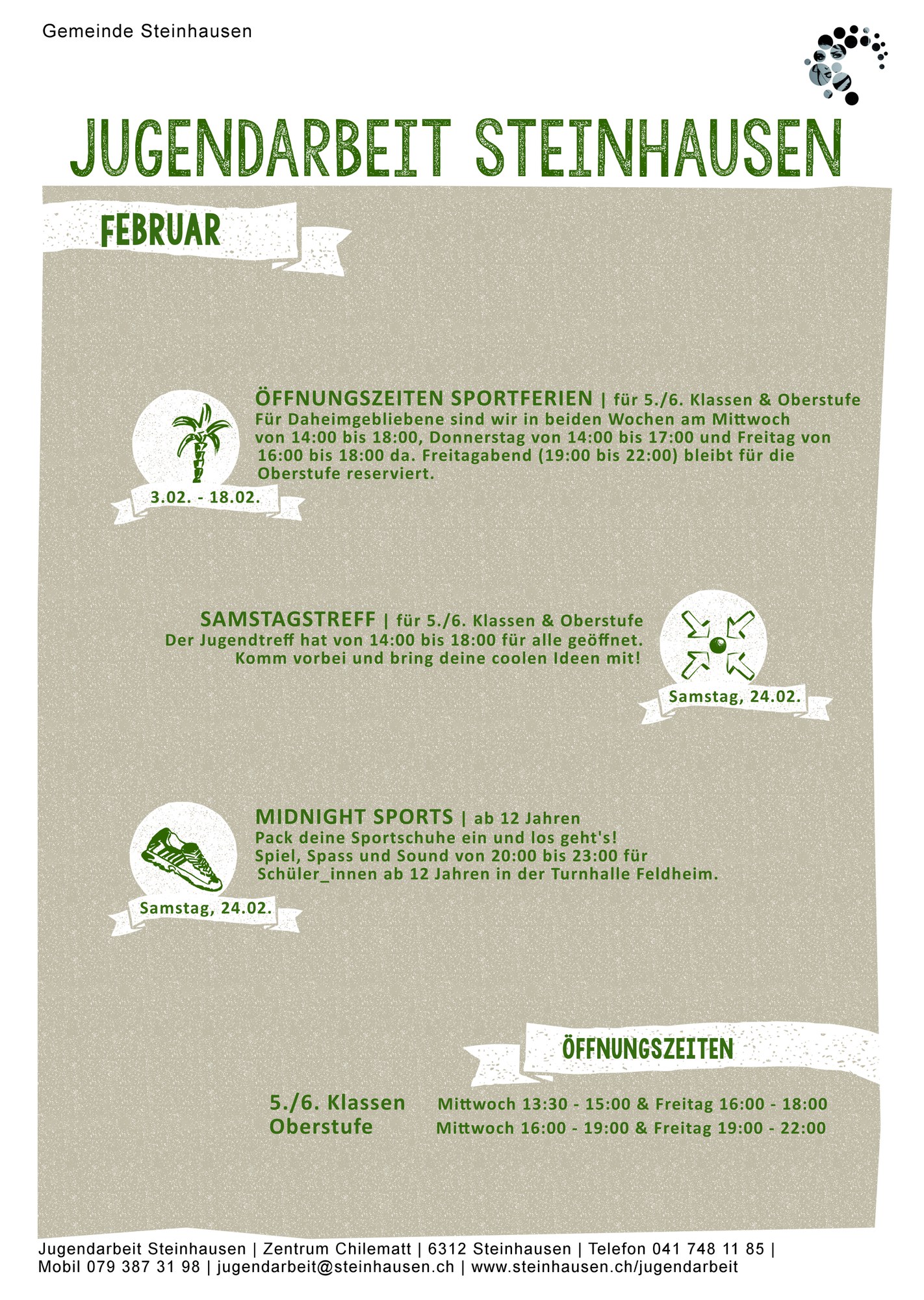02.02.2018Monatsprogramm Februar 2018Öffnungszeiten Sportferien, Samstagstreff und Midnigt Sports - so sieht der Februar bei uns aus!https://publisher-zgch-dev.webcloud7.ch/izug/platform/behoerden/gemeinden/steinhausen/jugendarbeit/infos/aktuelles/monatsprogramm-februar-1https://publisher-zgch-dev.webcloud7.ch/izug/platform/logo.png