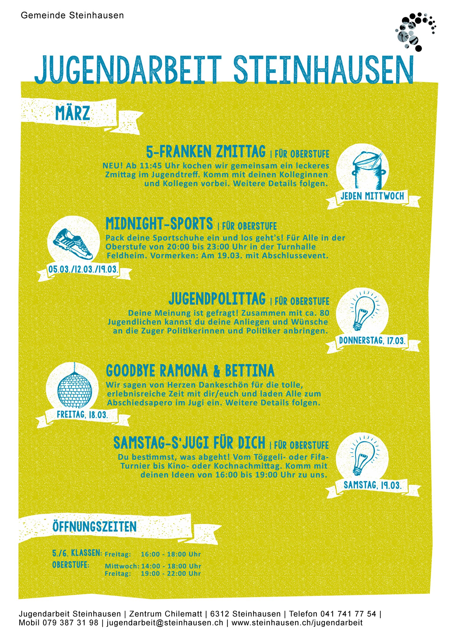 Das Monatsprogramm der Jugendarbeit Steinhausen für März 2016.