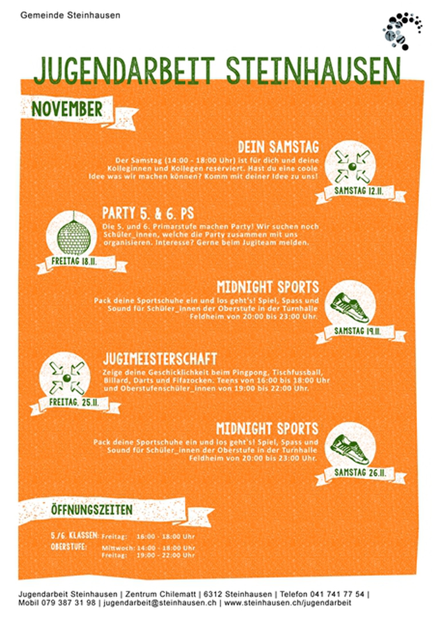 Dein Samstag, Party für die 5. und 6. Primarstufe, Midnight Sports, Jugimeischterschaft. Die Schlagworte im November. Mehr auf dem Programm.