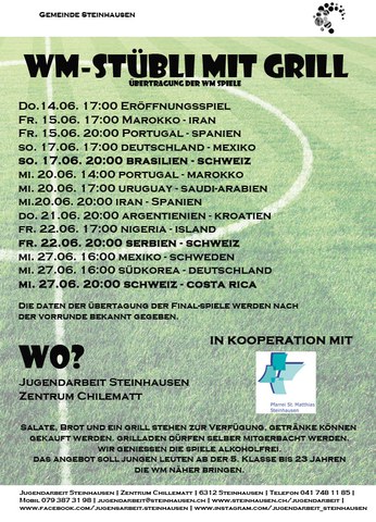 13.06.2018WM-Stübli 2018Komm vorbei, feiere mit uns und geniesse die Spiele mit Grilladen und Getränken.https://publisher-zgch-dev.webcloud7.ch/izug/platform/behoerden/gemeinden/steinhausen/jugendarbeit/infos/aktuelles/wm-stuebli-2018https://publisher-zgch-dev.webcloud7.ch/izug/platform/logo.png