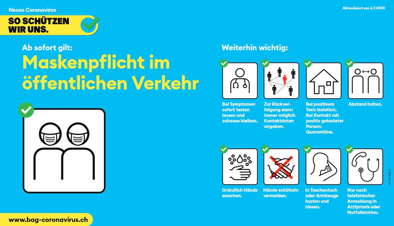 Das Bundesamt für Gesundheit (BAG) informiert auf seiner Webseite über «Neues Coronavirus» ausführlich über die Verhaltensregeln und aktualisiert sie regelmässig.