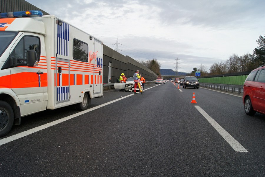 Kurz nach 14:30 Uhr kam es in Steinhausen auf der Autobahn A4a in Fahrtrichtung Cham / Luzern zu einem Selbstunfall. Nach ersten Aussagen der Insassen wurde das verunfallte Auto korrekt überholt, wobei die Beifahrerin erschrak. Dies wiederum erschreckte die Lenkerin, welche in der Folge in die rechte Leitplanke prallte.