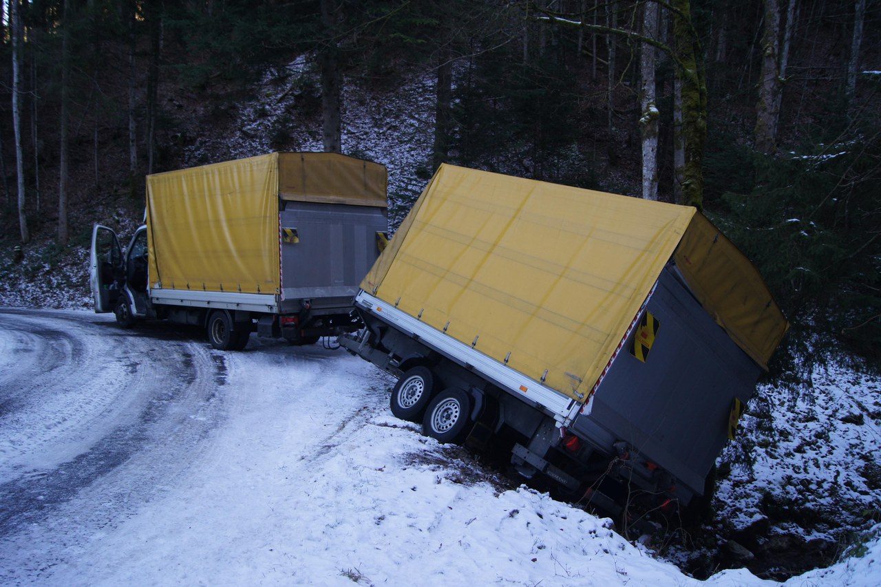 Ein Chauffeur folgte seinem Navi, das ihn über eine Waldstrasse führte. Weil die Pneus seines Lieferwagens mit Anhänger abgefahren waren, geriet das Fahrzeug auf der schneebedeckten Strasse ins Rutschen. Seine Bergung dauerte mehrere Stunden.