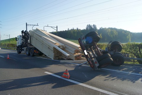 051 / Risch: Lastwagenanhänger auf der Autobahn umgekippt