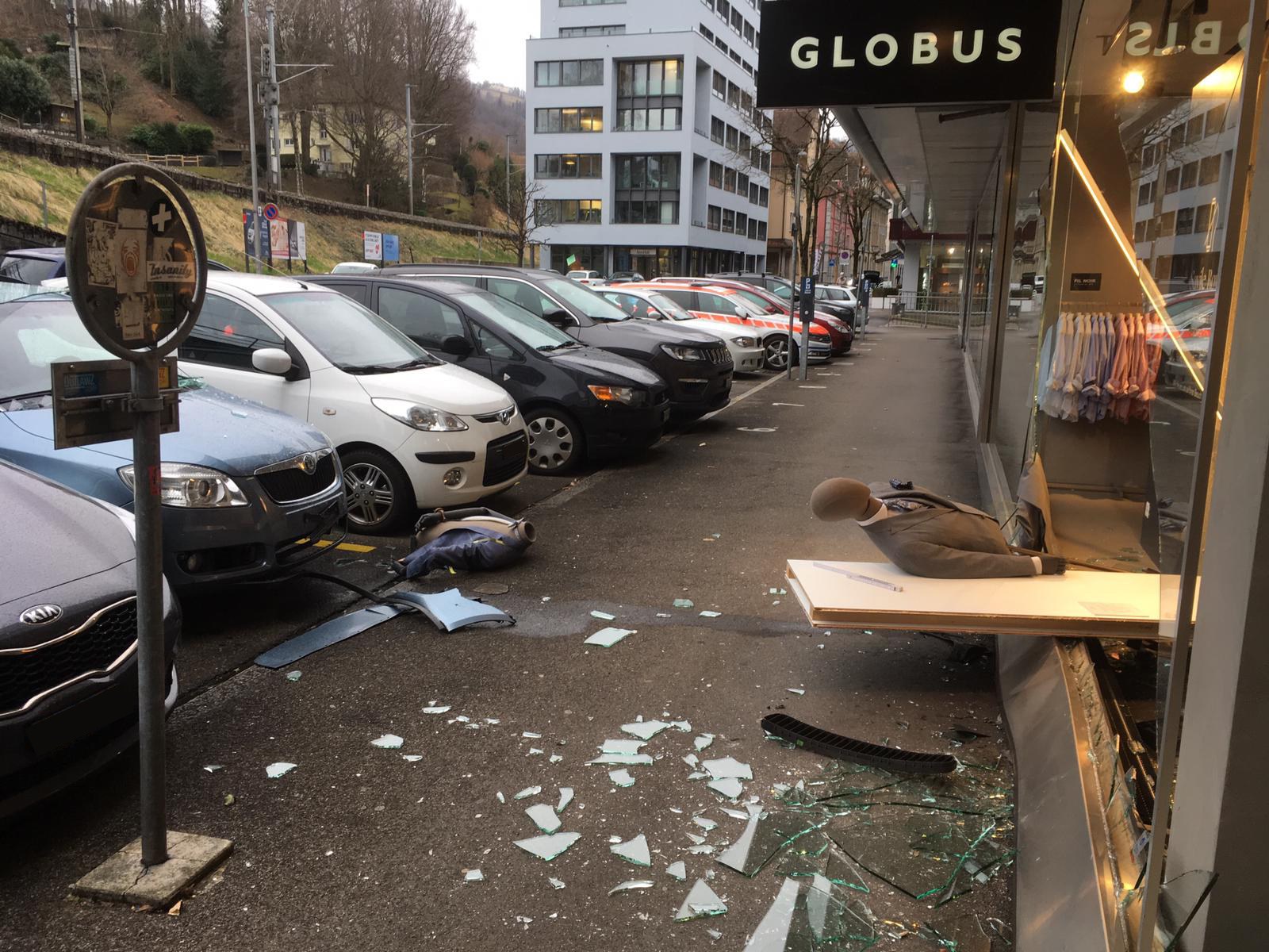 Ein Autofahrer ist bei einem Parkiermanöver in das Schaufenster eines Warenhauses gefahren. Verletzt wurde niemand, der Sachschaden ist beträchtlich.