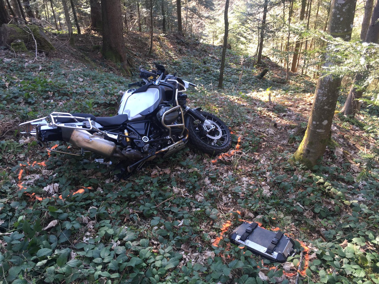 Am Samstagnachmittag (11. April 2020), um ca. 14.30 Uhr, fuhr ein 44-jähriger Motorradfahrer auf der Ratenstrasse in Oberägeri talwärts Richtung Alosen. Dabei kam es in einer Rechtskurve zur seitlichen Streifkollision zwischen dem linken Seitenkoffer des Motorrads und einem entgegenkommenden Personenwagen. Aufgrund dieser Streifkollision geriet der Motorradfahrer ins Schleudern, konnte aber gerade noch vom Motorrad abspringen, bevor dieses die angrenzende Böschung hinunter in den Wald stürzte. Der Motorradfahrer erlitt dabei leichte Verletzungen. Er wurde vom Rettungsdienst Einsiedeln vor Ort verarztet.