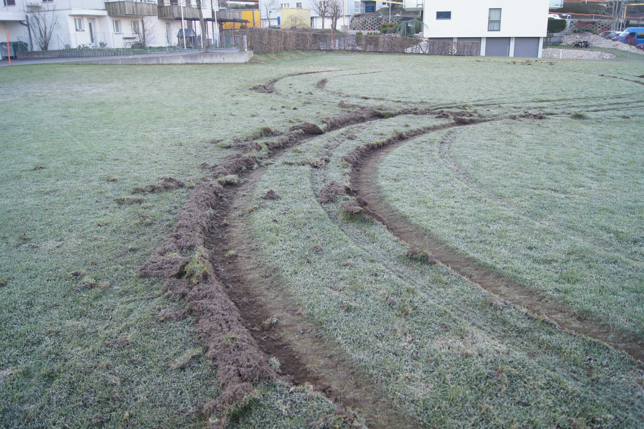 Unbekannte sind mit einem Fahrzeug über einen Rasenplatz gefahren und haben grossen Schaden angerichtet. Die Polizei sucht Zeugen.