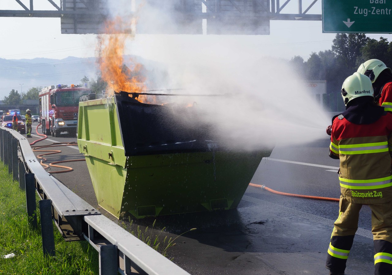 Der Brand ereignete sich am Freitag (25. August 2017), kurz nach 09:30 Uhr, auf der Autobahn A4a nach der Einfahrt Steinhausen in Fahrtrichtung Luzern. Die 23-jährige Lastwagenlenkerin wurde selbstständig auf das Feuer aufmerksam. Sie reagierte sehr gut, fuhr umgehend auf den Pannenstreifen und lud die brennende Mulde ab. Durch die ebenfalls sofort alarmierte Stützpunktfeuerwehr Zug (FFZ) konnte der brennende Inhalt der Mulde rasch gelöscht werden.