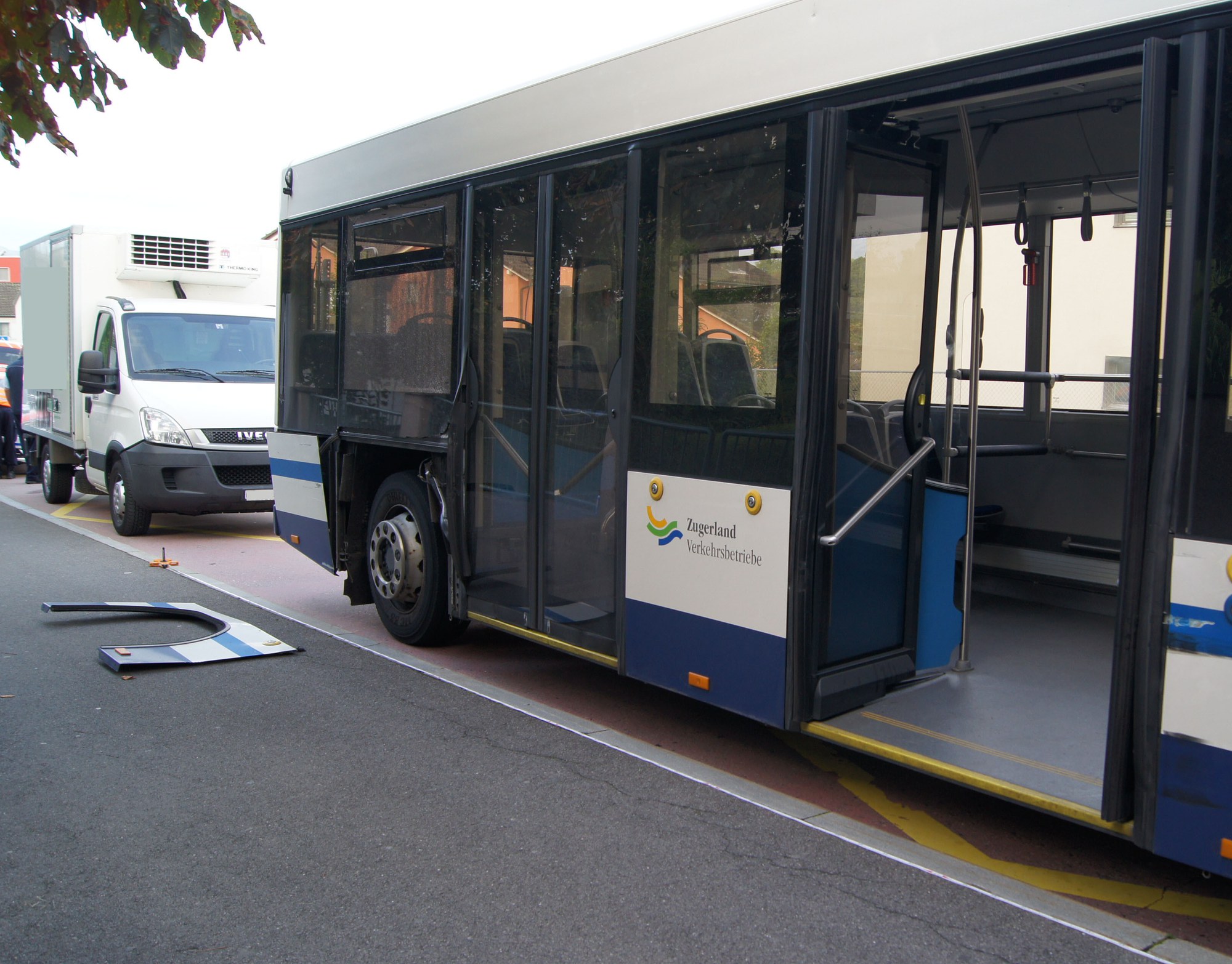 Am Freitagmorgen (16. September 2016), kurz vor 06:45 Uhr, fuhr ein Linienbus der Zugerland Verkehrsbetriebe von der Neugasse in die Ägeristrasse und beabsichtigte, weiter in Richtung Ägeri zu fahren. Gleichzeitig fuhr ein 51-jähriger Lieferwagenlenker rückwärts aus einem Parkplatz beim Kolinplatz auf die Strasse und prallte seitlich in den Busanhänger. Verletzt wurde niemand. Der Sachschaden an den beiden Fahrzeugen beträgt rund 35'000 Franken.