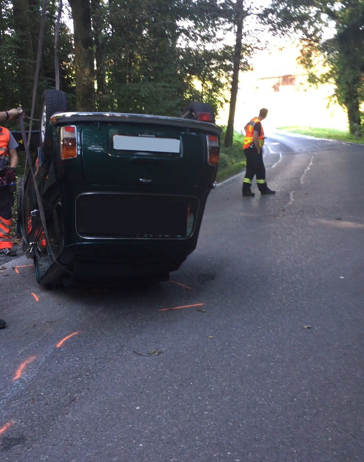 Nach einem Selbstunfall landet ein Auto auf dem Dach. Die Fahrzeuglenkerin wurde zur Kontrolle ins Spital eingeliefert.