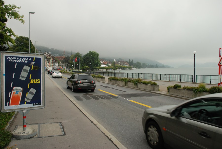 Die Fahrzeuge der Blaulichtorganisationen nutzen einen Busstreifen nur dann, wenn sich dieser in Mittellage befindet. So zum Beispiel auf der Chamerstrasse in Zug, wo der gelb markierte Fahrstreifen für Busse zwischen den beiden Fahrbahnen des Individualverkehrs liegt.