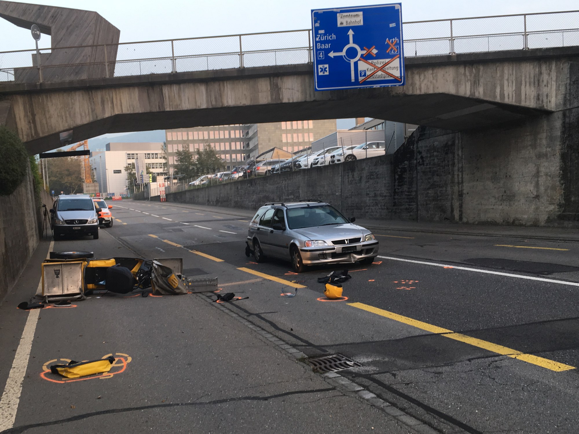 Für die Bergung der Patientin, die Spurensicherung durch den Kriminaltechnischen Dienst der Zuger Polizei und Aufräumarbeiten musste die General-Guisan-Strasse in beiden Richtungen gesperrt werden.