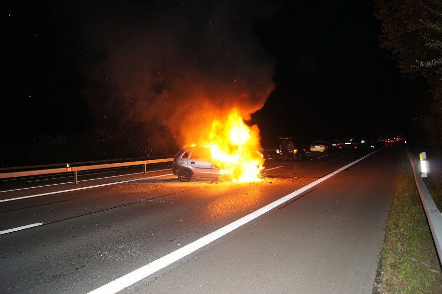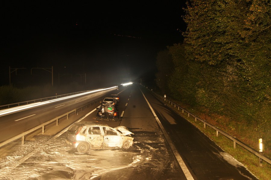 Am Dienstagabend (2. Oktober 2012) staute sich der Verkehr auf der Autobahn A4 in Fahrtrichtung Gotthard vor der Ausfahrt Küssnacht SZ wegen eines umgekippten Anhängers mehrere Kilometer zurück (vgl. Medienmitteilung Nr. 295 / 2012 der Kantonspolizei Schwyz). Kurz nach 19:30 Uhr bemerkte eine 28-jährige Automobilistin den Stau zu spät und prallte - noch auf Rischer Boden - in voller Wucht in die Kolonne. Drei vor ihr stehende Fahrzeuge wurden ineinander geschoben. Die Unfallverursacherin selbst schleuderte nach rechts, wo sie mit einem weiteren Auto kollidierte. Ihr Auto fing sofort Feuer und brannte vollständig aus.