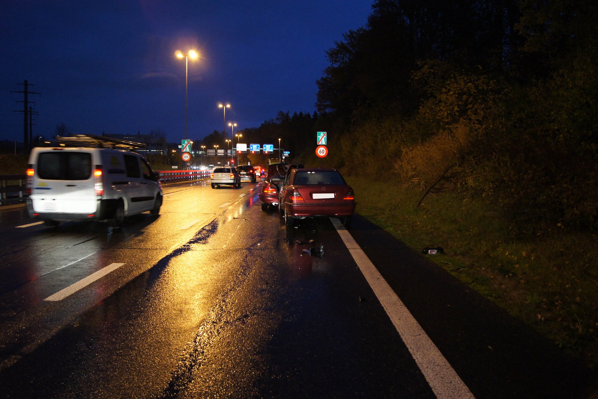 fuhr von hinten auf eine stehende Fahrzeugkolonne auf und prallte in den Anhänger eines Lieferwagens. Nach dem Aufprall fuhr der Unfallverursacher rechts am Lieferwagen vorbei, über die Sperrfläche, zurück auf den Normalstreifen und prallte dort in ein Auto. Dieses wurde nach vorne in das Heck eines weiteren Fahrzeugs geschoben. Verletzt wurde niemand. Zwei Fahrzeuge erlitten Totalschaden.