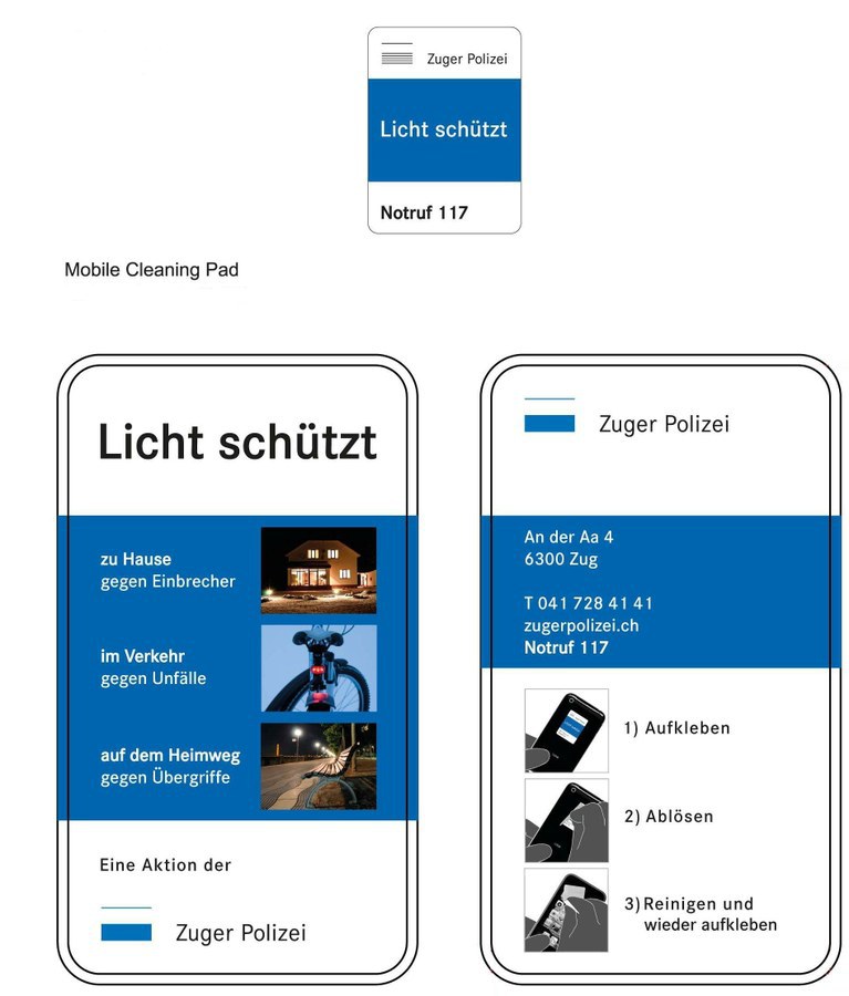 In diesem Zusammenhang werden die Einsatzkräfte der Zuger Polizei auch sogenannte Mobile Cleaning Pads als Give-away an die Verkehrsteilnehmenden abgeben. Diese reinigen Displayoberflächen von Smartphones zuverlässig und lassen sich ohne Spuren zu hinterlassen einfach auf der Rückseite des Handys fixieren. Das Pad erinnert den Benutzer stets daran, dass Licht schützt - nicht nur wie erwähnt vor Unfällen, sondern auch vor Einbrechern und Übergriffen.