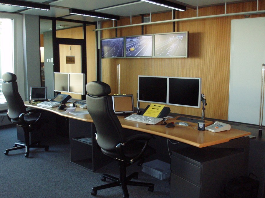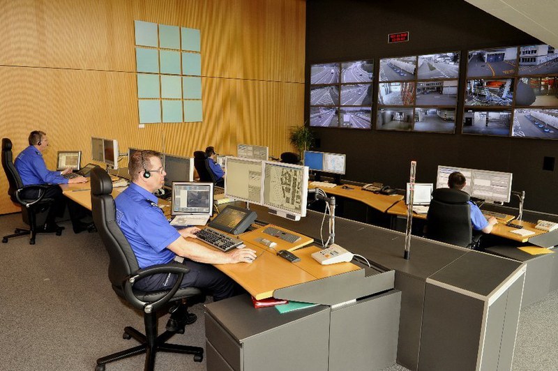 Die Einsatzleitzentrale der Zuger Polizei verfügt über vier identische Arbeitsplätze, die mit den modernsten technischen Standards ausgerüstet sind. Zwei weitere Arbeitsplätze befinden sich in der angrenzenden Leitstelle. Von dort werden grosse Ereignisse wie Sportveranstaltungen, Naturkatastrophen oder Grossbrände geleitet und bewältigt.