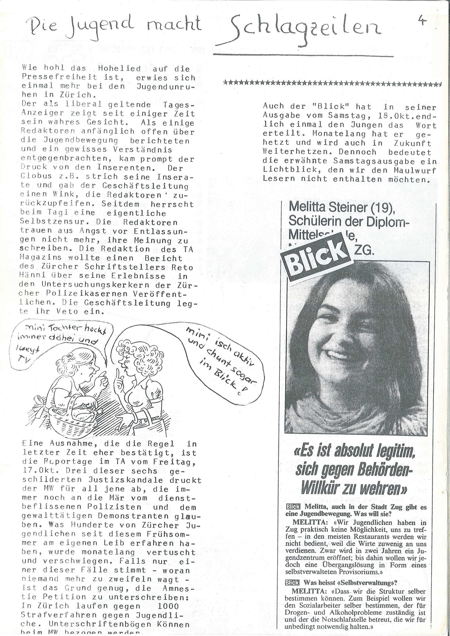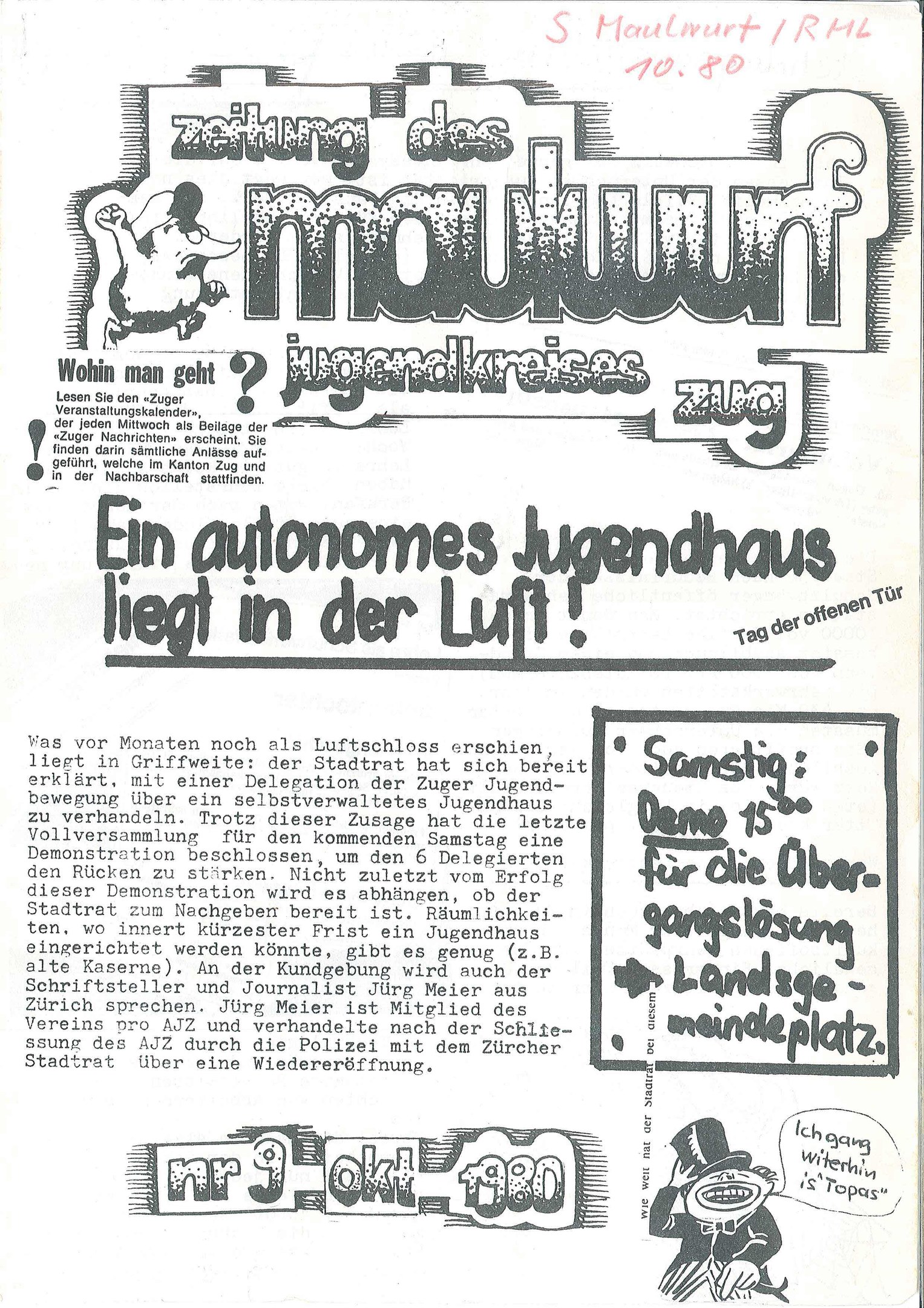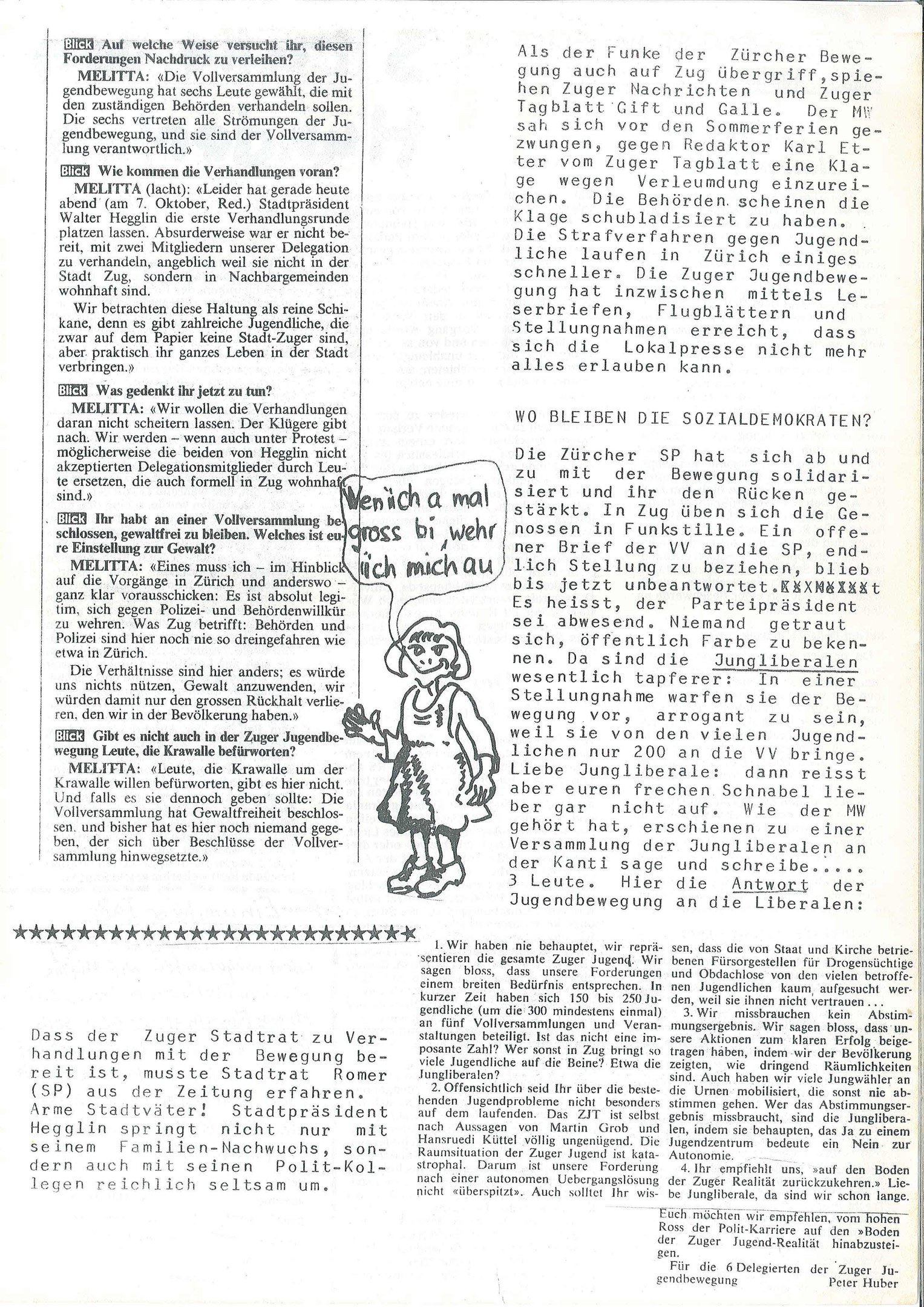 Jugendunruhen Zuger Art Jugendunruhen Zuger Art https://publisher-zgch-dev.webcloud7.ch/izug/platform/behoerden/staatskanzlei/staatsarchiv/geschichtswettbewerb/jugendunruhen-zuger-art https://publisher-zgch-dev.webcloud7.ch/izug/platform/logo.png Jugendunruhen Zuger Art Jugendunruhen Zuger Art In den 80ern Jahren durchzogen die Jugendunruhen die Schweiz. In Zug machte der Maulwurf-Jugendkreis der Revolutionären Marxistischen Liga (RML) von sich reden. Das Original wird im Staatsarchiv Zug aufbewahrt: Signatur StAZG G 395.4.12