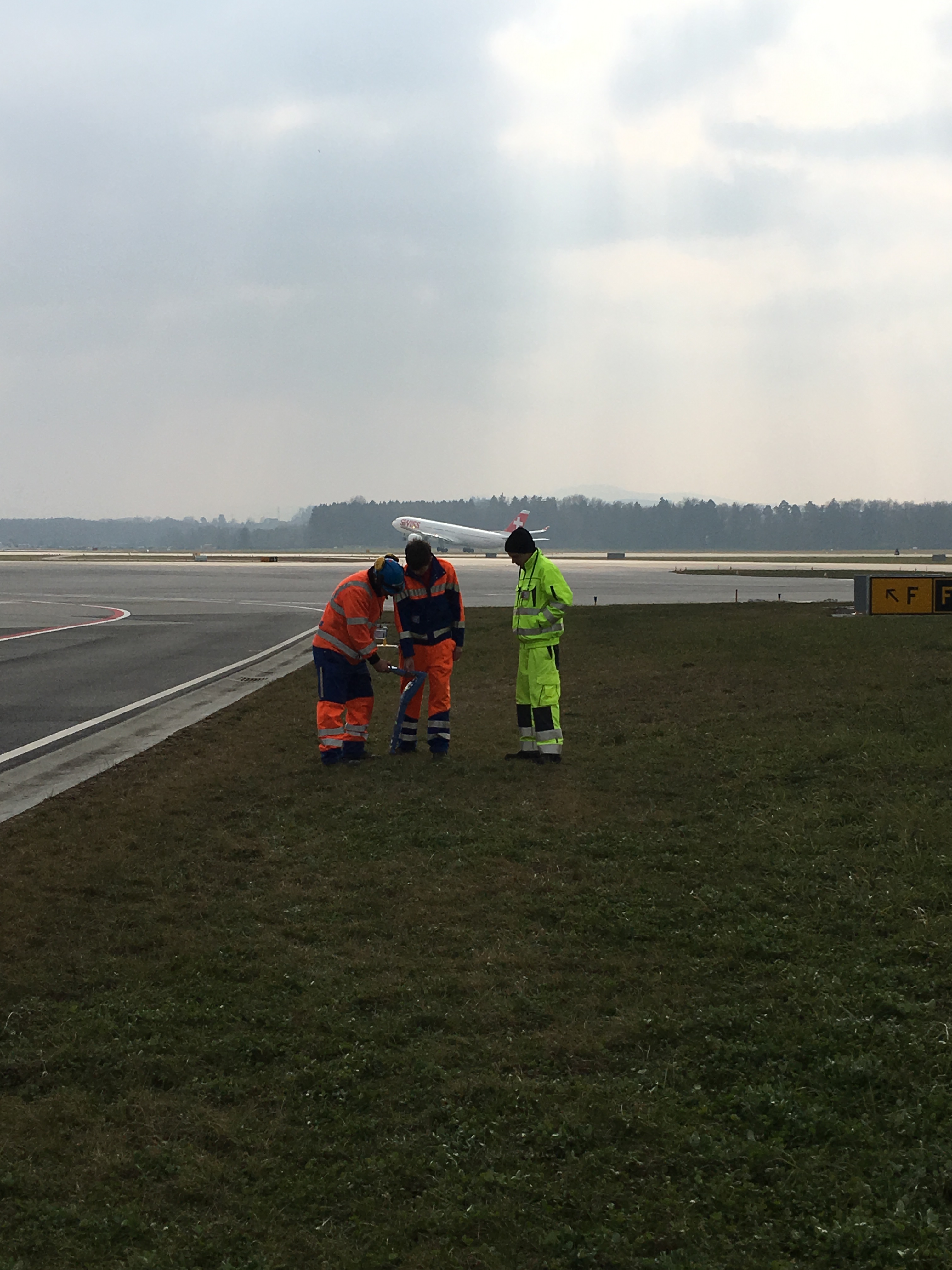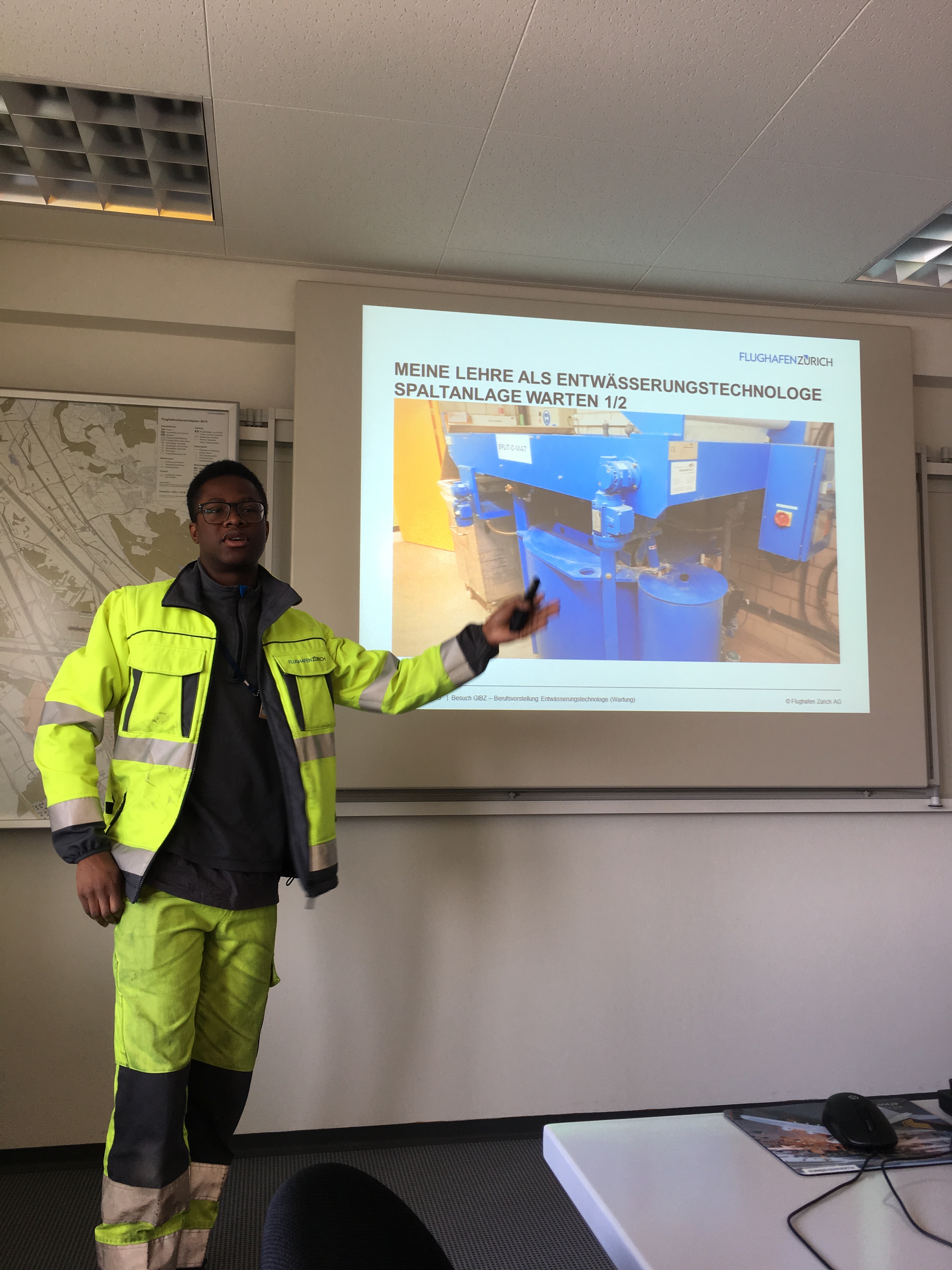 Im März 2016 konnten die angehenden Entwässerungstechnologen und Entwässerungspraktiker des GIBZ auf Einladung der Airfield Maintenance der Flughafen Zürich AG die Abwasserbehandlung am Flughafen Zürich besichtigen. Mit seiner Fläche von rund 880 Hektaren, einem Kanalisationssystem von etwa 200 km Leitungslänge und 15 000 Mitarbeitenden sowie gegen 90 000 Reisenden und Besuchenden täglich kann der Flughafen Zürich mit einer Stadt verglichen werden - auch in Bezug auf einen zeitgemässen Gewässerschutz. Am Flughafen Zürich gibt es eine Reihe von Besonderheiten: die Reinigung der Enteiserabwässer aus der Flächen- und Flugzeugenteisung, die Vorbehandlung der Abwässer der Flugzeugtoiletten sowie aus dem Unterhalt oder Revitalisierungs- und Pflegemassnahmen an Fliessgewässern. Paul Furrer erläutert: «Ein idealer Ort, um jungen Berufsleuten einen Einblick in ihre künftigen Arbeiten zu gewähren.»
