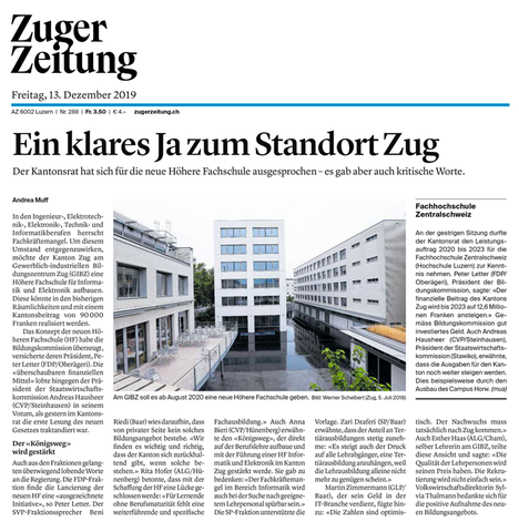 13.12.2019 / Zuger Zeitung: Ein klares Ja zum Standort Zugfür die Höhere Fachschule für Informatik und Elektronik HFIE