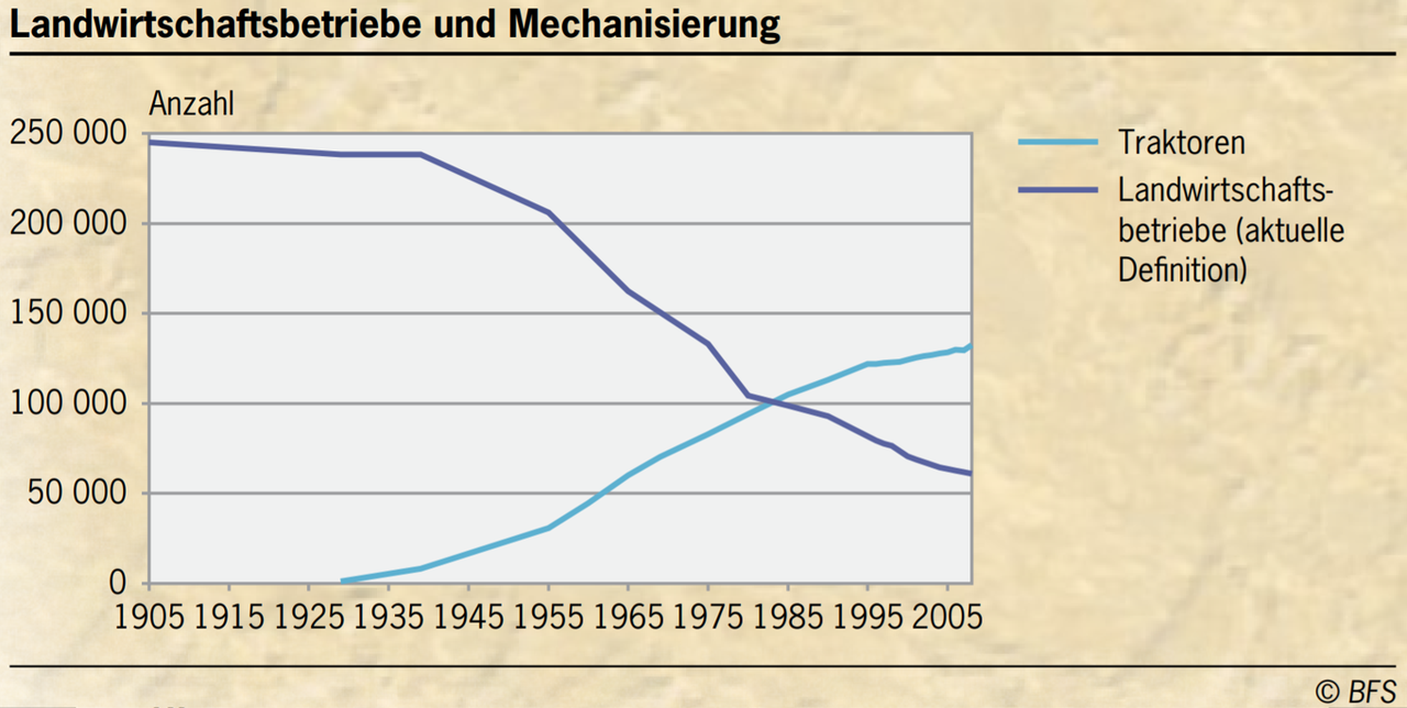 Since World War II an extreme structural change has taken place in the Swiss agriculture. As a result, the number of farms has fallen sharply, and in return fewer and fewer people have had to cultivate more and more agricultural land. This could only be done with the help of tractors and machines.